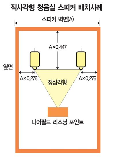 - 스피커는 '삼각형 구도'로 배치: 양쪽 스피커와 머리가 정삼각형이 되도록! (좌우 간격 = 거리)